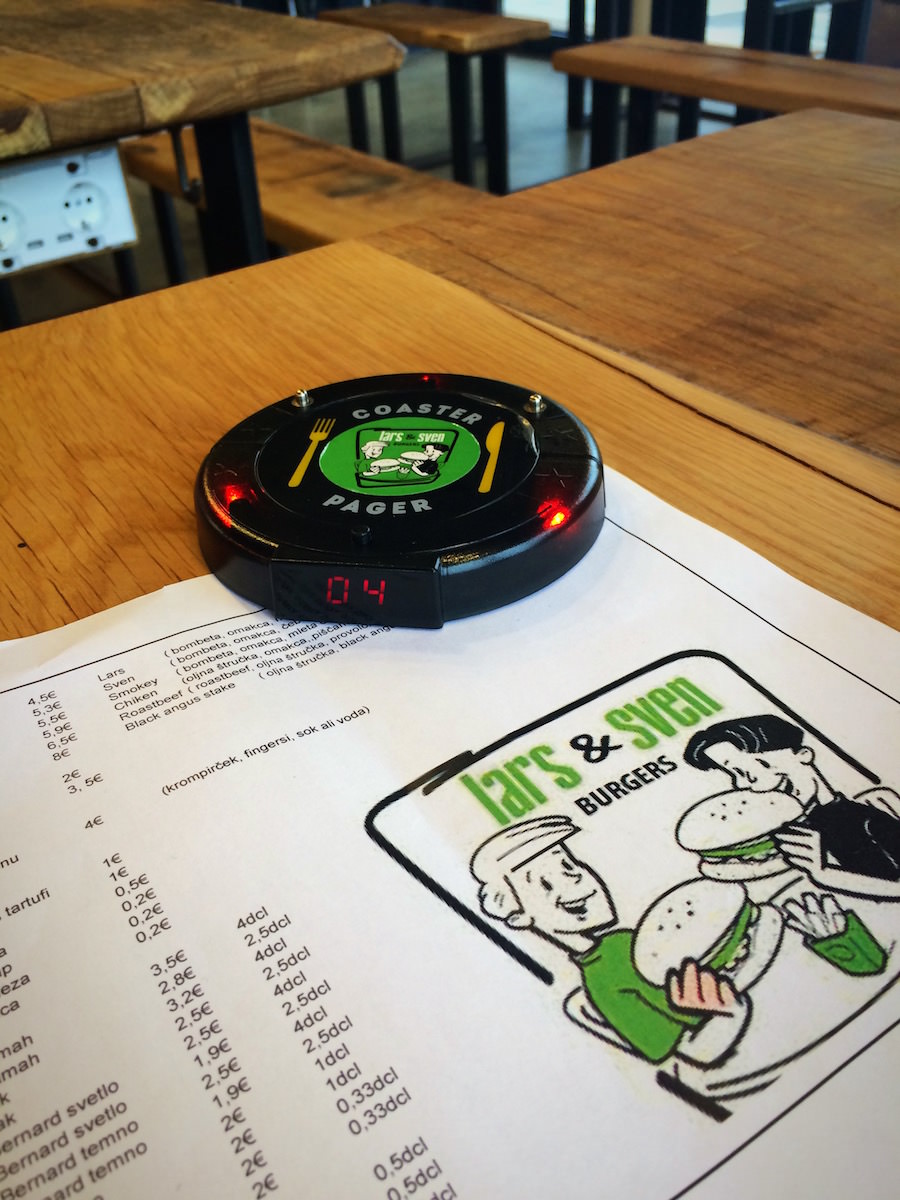 Prva stvar, ki me je zmotila je bilo dejstvo, da še ne sprejemajo kartic. Ok. Začetek je in na srečo je bankomat v Leclercu precej blizu. To sem preživel. Ko sem naročil, sem se vsedel in zraven poleg računa dobil še “spaceship” (coaster pager), ki opozori, da je naročilo pripravljeno – ja, gre za self service postrežbo, kot sem jo navajen iz Hood Burgerja.