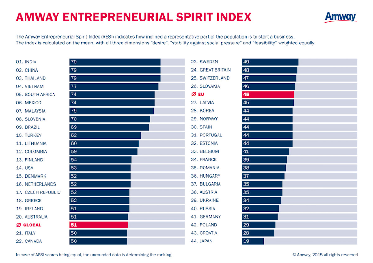 Podjetje Amway vsako leto opravlja globalno raziskavo, v kateri raziskuje odnos do podjetništva v posameznih državah, med drugim tudi v Sloveniji. Ključni izsledki o splošni podobi Slovenije nakazujejo počasno okrevanje gospodarstva in rast mednarodne konkurenčnosti tržno usmerjenih, inovativnih podjetij v zasebni lasti. Razvoj slednjih v projektno delo ali start-up podjetja najbolj pritegne nadarjene, mlade in izobražene posameznike, ki v podjetništu v največji meri iščejo samoizpolnitev oziroma možnost uresničitve lastnih idej. V primerjavi z evropskimi rezultati Amwayeve raziskave je delež Slovencev, ki v podjetniški praksi iščejo samoizpolnitev višji za kar 18 odstotnih točk.