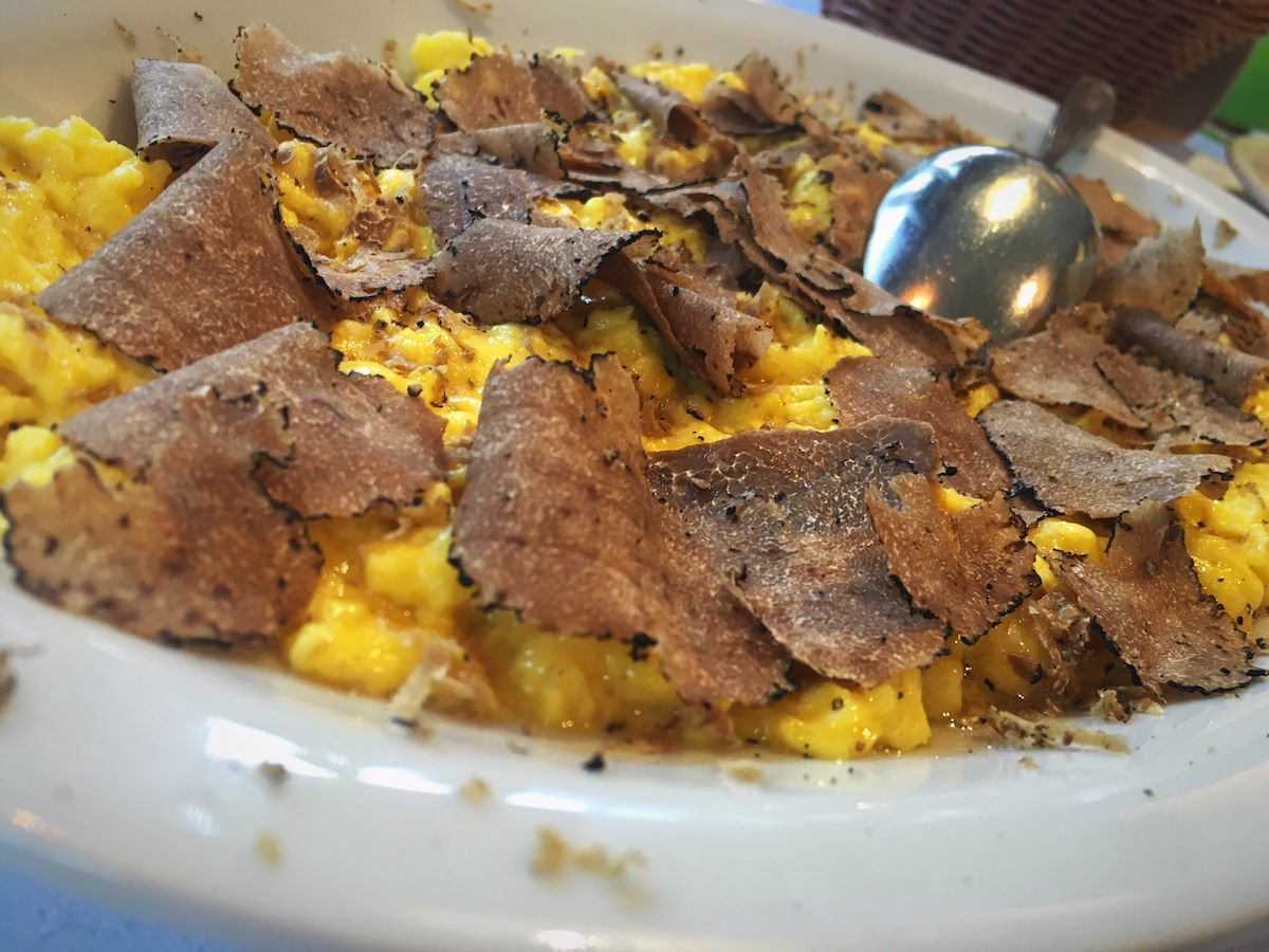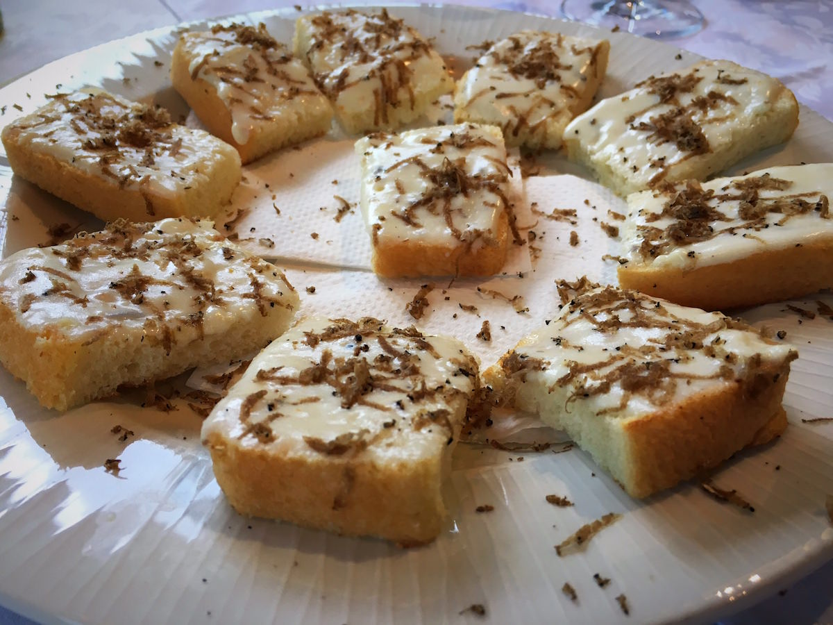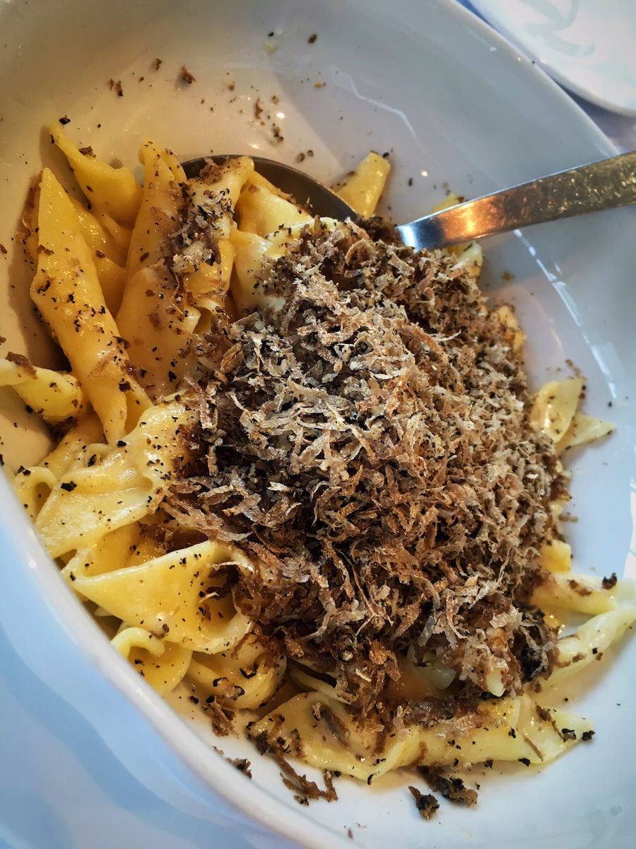 Naslednja jed sta bili juhi – iz divjih špargljev in bučk. Odlično in okusno. Sledila so “vmešana” jajca z veliko porcijo črnih tartufov. Ljubitelji tartufov bi verjetno skakali v zrak od veselja, saj pri tartufih ne “šparajo”. Naslednji dve jedi sta bili fuži z obilno porcijo tartufov in domači njoki z boškarinom.