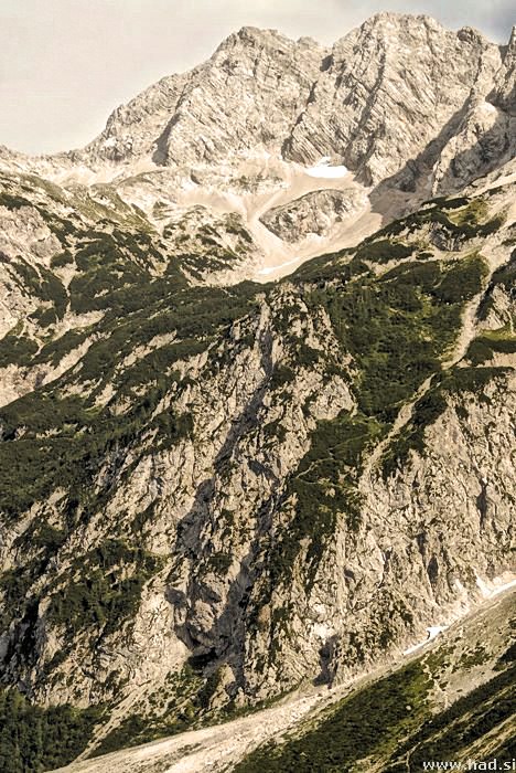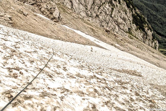 Moram priznati, da se je Barbka odlicno odrezala in povsem suvereno precila Zrelo. Po precenju ledenika, ko se nama je zazdelo, da bo sedaj pot povsem preprosta, pa sva odkrila, da temu se ne bo tako. Plezanje po zraku je precej adrenalinsko, moj pogled pa je bil prikovan v steno in niti za trenutek nisem pogledal v prepad pod menoj. Se ista stena z drugacne perspektive in drugimi planinci. Taksna plosca, ko jo zagledas, ti nazene strah v kosti in kljub mehkim nogam, poskusas biti se bolj previden, kot si ze. Ampak na sreco sva kmalu zagledala Cesko koco in se zavedala, da ni pred nama vec zajl in prepadov in precej ledenikov. Tabla je odpirala vec moznosti, kam bi lahko se zavila, pa vendar je bila pot pri Jezerskem, tista prava pot, ki sva se je drzala. Iz daljave sva opazovala panoramo, ki se je odpirala pred nama in se zadnjic pogledala na najino turo, ki sva jo prehodila.