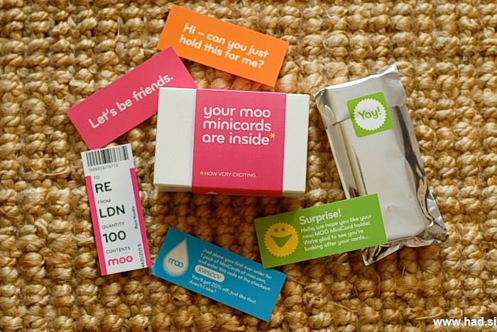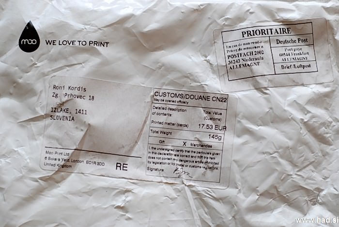 Moo je spletni servis, ki je narejen prijazno! Cena za 100 vizitk je €13.79 (sami izberete dizajn, oz. karkoli želite na zadnji strani in tako je lahko vsaka vizitka unikatna) in dobil sem jih v štirih dneh.