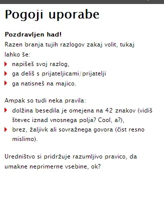 In v čem je smisel tega projekta? Ko si prijavljen in prebereš pravila uporabe (kako zelo Vuk) napišeš vzrok, ki se ti zdi problematičen, oz. karkoli ti pride na misel in zraven se ti doda Grem volit. In potem imaš možnost (zakaj hudiča pa to še ne dela??) da si daš tiskati unikatno majico s svojim sloganom za 10€.