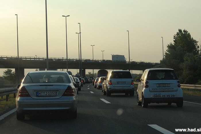 In tako naprej. Blizu Zagreba se je začela kolona. Zgodba kot pri nas, tovornjaki prehitevajo po odstavnem pasu, vendar njihovi policajo opravljajo svoje delo vestno – na motorju je pripeljal od zadaj, ga ustavil in začel pisati kazen. Potem je bil nekaj časa mir. Slovenci, ki so kraljevali na prehitevalnem pasu, pri vožnji okoli 110 km/h so se počutili kot doma. Vendar so mi šli na k…. Sploh naveza dveh vozil MS in GO, ki sta bila prepričana da je prehitevalni pas rezerviran za njiju sta bila precej hud trn. Ampak mi je uspelo ju prehiteti. Mala Kapela in Sveti Rok – brez problemov – edino malce se je ustavilo pri “odmorištu Jasenice”.