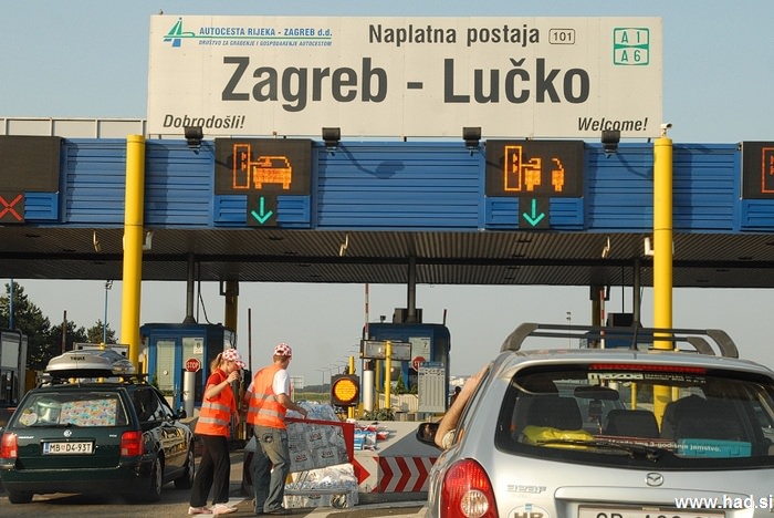 In prihod na CRO mejo. Prijazni “cariniki” (upam, da nisem zgrešil) so naju brez preverjanja spustili “v lepo njihovo”. In par metrov naprej, kjer imajo prvo cestnino in na ta način od vseh tujcev poberejo vsaj 5 kun, so bili fantje in dekleta ki so delili vodo Jano in pa njihov zemljevid! Pohvale vredna poteza.