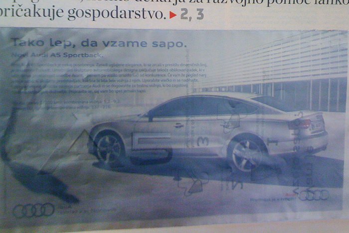 Tako lep, da vzame sapo – naslov oglasa za Audi A5 Sportback, ki je bil včeraj v časniku Finance. Definitivno precej drugačen in inovativen oglas, kot smo jih sicer pri nas navajeni. Precej podoben oglasu za Audi A8 – 89.212.8.196 oz. audia8.si, ki je bil pred dvema letoma v časopisu Delo.