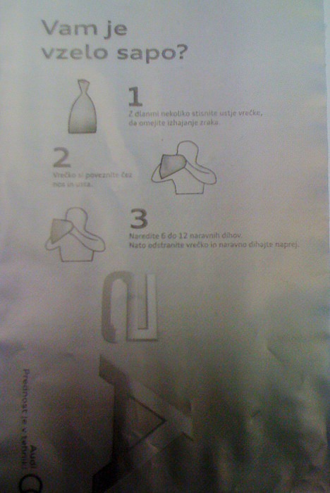 Ampak ena stvar me moti pri tem oglasu. Namreč oglaševalec lahko še tako poskuša prepričati ljudi, da je Audi A5 avto, ki ti vzame dih in za to potrebuješ vrečko, da lahko začneš spet dihati, ko pa je prva asociacija ob pogledu na vrečko in človeka, ki si jo tišči k obrazu zelo preprosta – gre mu na bruhanje. Se motim?
