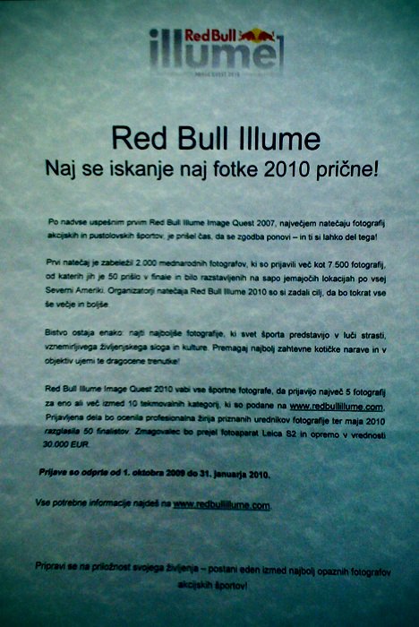 Fotografski natečaj, oz. vabilo športnim fotografom, da prijavijo največ 5 fotografij na strani http://redbullillume.com/ in se potegujejo za prvo nagrado: fotoaparat Leica S2 in opremo v vrednosti 30.000€! Prijave so možne od 1.10.2009 do 31.1.2010.