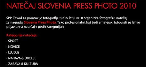 SPP Zavod za promocijo fotografije že drugič organizira natečaj SLOVENIA PRESS PHOTO, ki je namenjen tako profesionalnim, kot zahtevnim amaterskim fotografom.