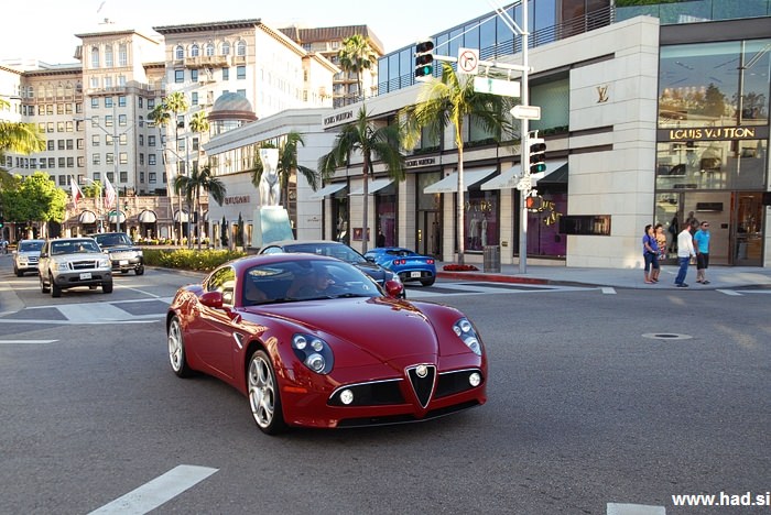 Alfa Romeo 8C Competizione – eno izmed 500 izdelanih sem imel možnost opazovati na Rodeo Dr. v Los Angelesu. Zadeva je čudovita, njen lastnik, ki se je vozil gor in dol par ur, malce manj.