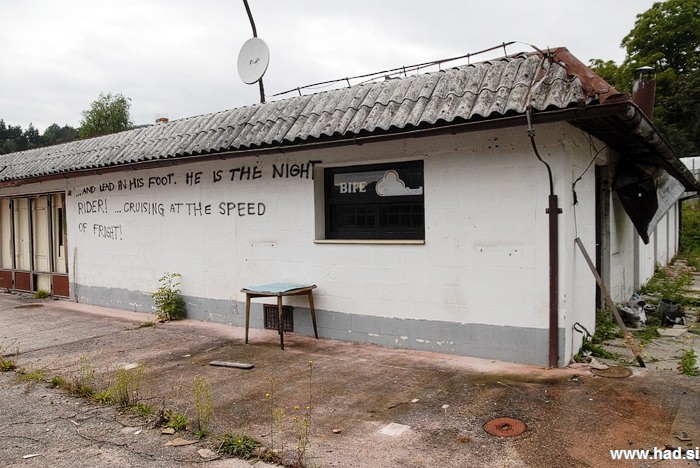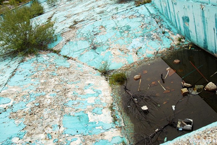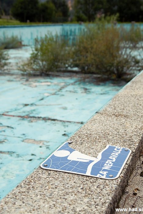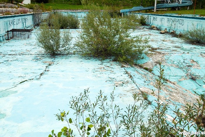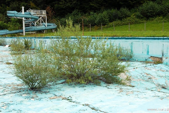 Namesto vode v bazenu, rastejo drevesa. V kotu, kjer je bila globina bazena 4 metre in mi je kot mulcu predstavljala neskončno globino, ležijo stoli in mlakuža, ki ne pronica iz bazena, ki že leta in leta spušča. Tam kjer je bil gostinski obrat in kjer smo preživeli veliko večerov med srednješolskimi počitnicami, je vse sesuto in zažgano.