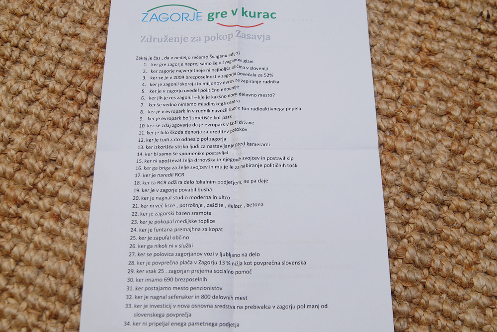 Drugače pa je že sam naslov malce nespametno napisan “zagorje gre v ku**c”, spodaj pa nadaljuje “Združenje za pokop zasavja”. Čisto mimo, kar pomeni naj občani podprejo njih kot neko združenje ki bo pokopalo Zagorje (direktno mi je padlo na misel ko sem prvič videl tale zapis). Sicer se spodaj navezuje direktno, da naj občani ne podprejo sedanjega župana, vendar mislim da so naredili kontra efekt (vsaj pri meni bi ga).