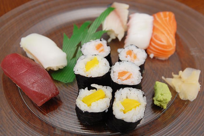 6. Dejansko imaš enega z lososom in enega z zelenjavo. Zelenjavnega imajo redno tudi v Mercatorju v Šiški tam pri zelenjavnem pultu. Zadeva je super okusna, odlična za lahko večerjo ali vikend zajtrk. Zraven priložijo še sojino omako, ščepec wasabija in listič na nek način prepariranega ingverja. Zdravo, dobro, poceni, primerno tudi za hitro malico med delovnim časom.
