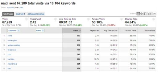 In če k temu dodam statistiko iskanja, ki jo spremljam preko Google Analyticsa – za Najdi.si: v letu 2010 sem dobil 67,289 obiskov iz Najdija na 18,104 ključnih besed.
