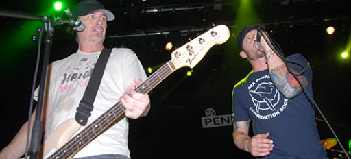 Če je bila publika pri prvih dveh bandih zadržana, se je s prihodom skupine Pennywise na oder vse skupaj spremenilo. Ker sem stal v prvi vrsti s fotoaparatom v roki, nisem bil nič presenečen, ko sem že pri prvem komadu dobil skoraj pol litra “pira” za vrat. Ah, ja – punk še ni hin! Ko pa se je začel množičen “stage diving”, sem rajši zapustil prve borbene linije – par sem jih uspel uloviti, ko so se vrgli skoraj na glavo med množico. No, vsi niso bili tako srečni – na fotografijo v rdeči majici je fant, ki je stejdž dajval z nogami naprej in ko je to naredil parkrat se mu je folk pod odrom umaknil in pristal je z razbito glavo na tleh. Pevec skupine Pennywise Zoli, je prekinil koncert in zahteval da se fantu pomaga. Prav tako pa je cel koncert opozarjal na to, da naj vsi pomagajo vsem na koncertu in da nasilje nima vstopa v ta prostor.