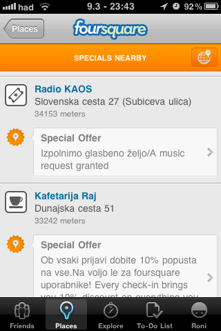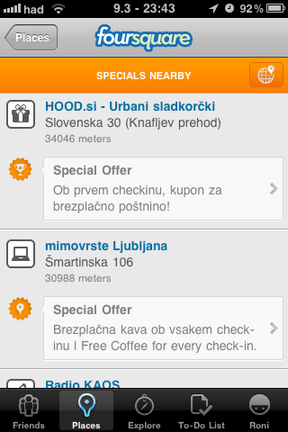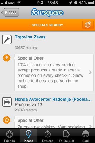 Slovenija počasi caplja za ostalimi in trenutno imamo 9 “special offer nearby” pri nas. Potencial geolokacijskih storitev so sedaj izkoristili: