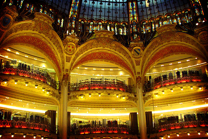 Galeries Lafayette je 10-nadstropna veleblagovnica – nakupovalna hiša sredi Pariza, ki ima korenine v letu 1893. Trgovina sodi ob bok Harrodsu v Londonu, njima pa poskuša “konkurirati” naša galerija Emporium. Raj za petičneže s polnimi denarnicami in ženske brez okusa, ki z denarjem poskušajo “kupovati” okus. Cene v trgovini? Malenkostne – upam, da bom preživel pogled na izpisek za American Express konec meseca!