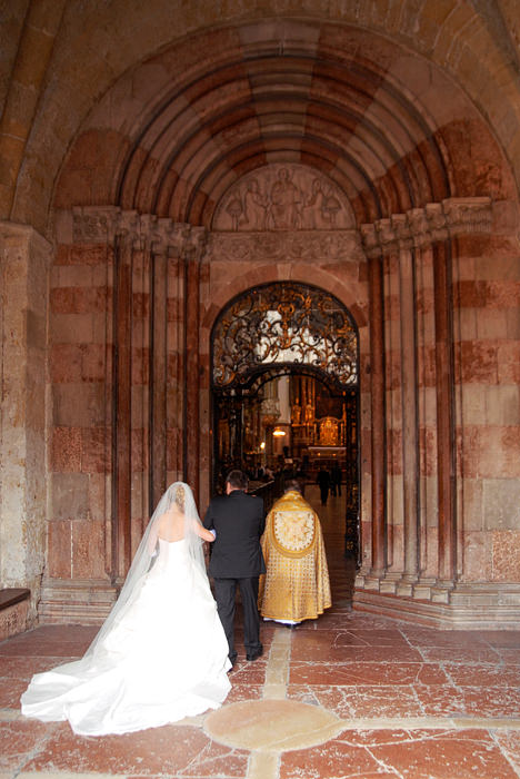 Kočijaž v obleki je pripeljal nevesto, ki jo je sprejel oče in njena družica in sta jo potem v spremstvu “duhovnika?” pospremila pred oltar v cerkev. Glede na to, da nisem pogost obiskovalec cerkva, mi je bila tale precej zanimiva – bila je topla in v njej ni smrdelo…