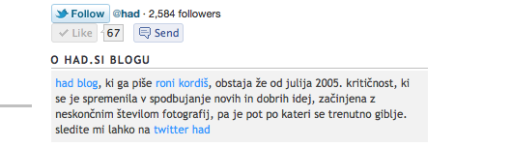 Na spletnem mestu si lahko generirate svoj Twitter Follow Button, ki ga preprosto dodate v svoje spletno mesto. Seveda sem moral sam tudi to takoj stestirati in sedaj je na had.si blogu.