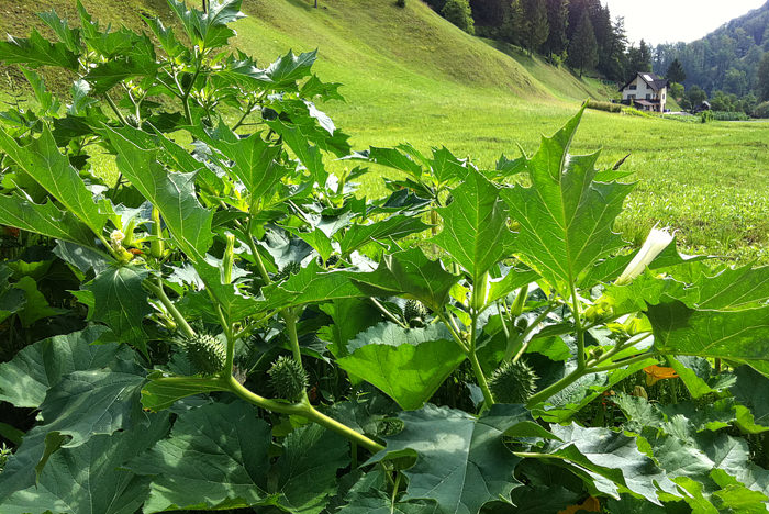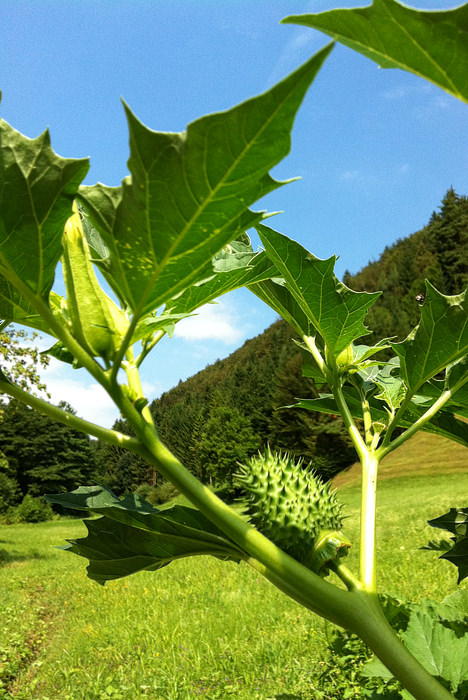 Datura Stramonium sodi med mamile in o njej sem pisal že leta 2006 (jeap, dolgo časa nazaj). To je bila droga, od katere sem bil sam najbolj zadet v življenju. Danes, med kolesarjenjem po naših krajih, sem jo zagledal na kupu gnoja (kjer najboljše uspeva) v družbi bučk. Uživanje Dature resno odsvetujem, saj lahko povzroči zelo hude posledice!!!