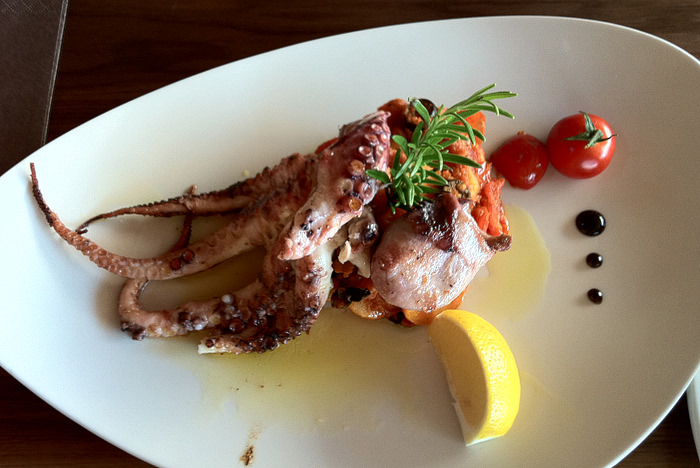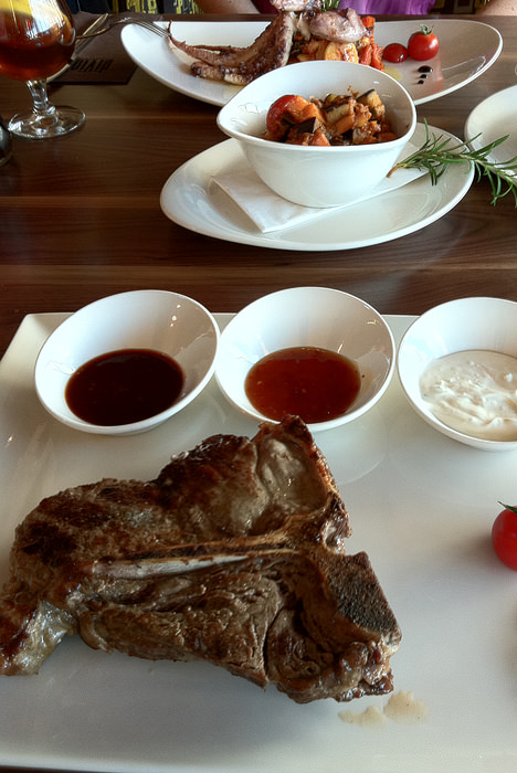 In včeraj sva ponovila vajo. Jaz sem se odločil za 500g T-Bone, boljša polovica pa za pečeno hobotnico. T-Bone je bil točno takšen kot ga imam jaz rad – brez koščka rdečega mesa in tako nežno mehak, da sem se spraševal kaj sem hudiča jedel do sedaj, ko sem naročil T-Bone v drugih restavracijah. Da o hobotnici niti ne pišem – odlična in okusna! Tako dobro, da ni bilo več prostora za sladice!