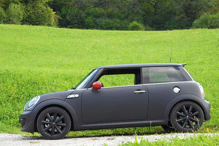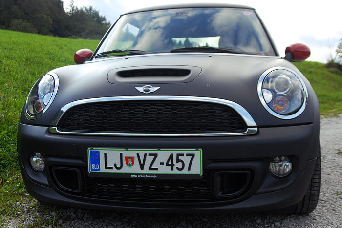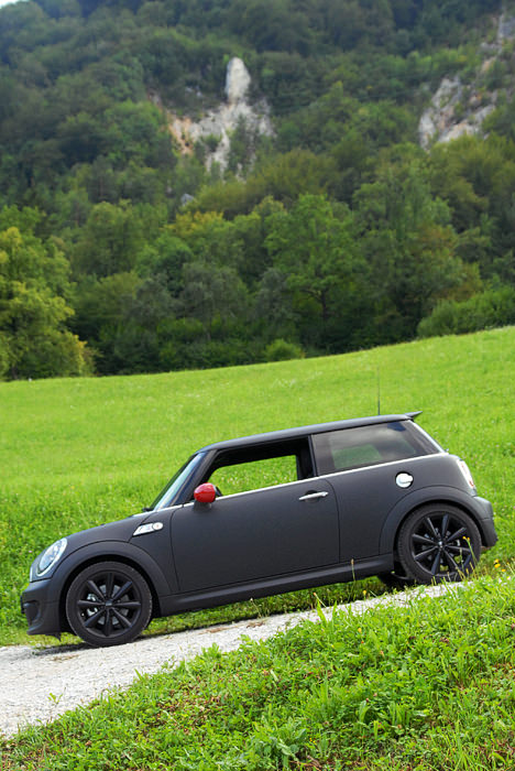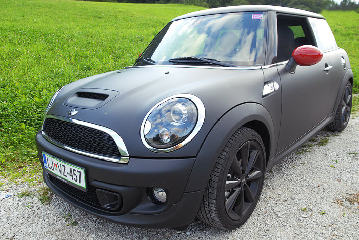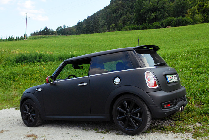 Vendar se tale MINI razlikuje od ostalih še po nečem, kar je precej opazno in privlači poglede ostalih udeležencev, kot tudi peščev ob cestah. In ne, to ni zvok, ki je sicer fenomenalen, ampak je njegova barva, saj je avto v celoti prelepljen s posebno črno mat folijo, ogledali pa sta v rdeči barvi.