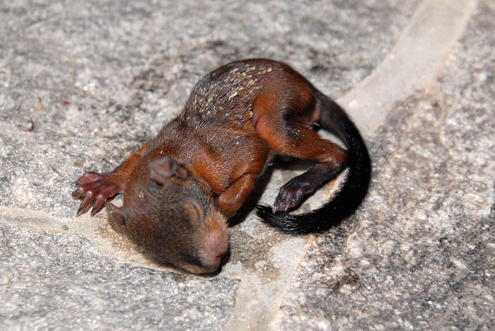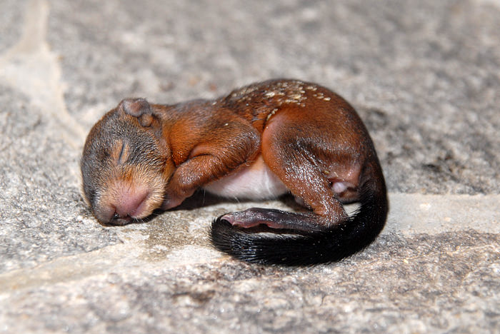 V nedeljo pa me je pričakalo malce večje presenečenje. Namreč pred hiško je ležala kepica, ki je nežno cvilila in se povsem počasi premikala. Mlada kuna, ki še niti ni imela odprih očk. Ker je kar nekaj mačk v bližini, sem se ustrašil za njo in poklical na dežurno veterinarsko postajo, kjer so prijazno razložili, da je to pač narava in da naj kunico dam nazaj v gozd, kjer bo preživela, ali pa tudi ne. Da je to samo del življenja in da sicer se da vzgajati kuno v “ujetništvu”, vendar da je možnost da preživi, ker je tako majhna, minorna.