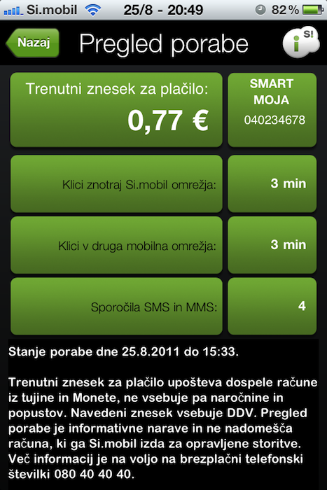 Meni je prvo najpomembnejše – enostaven pregled porabe preko aplikacije. Vendar, kot sem že zgoraj omenil, se je potrebno za ta pregled najprej registrirati (vsa navodila so zapisana) in potem lahko brez problema uporabljaš storitev, ki je brezplačna, plača se samo prenos podatkov!