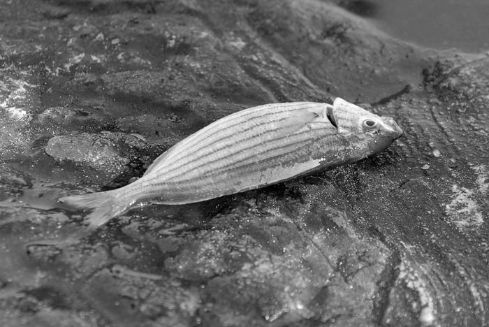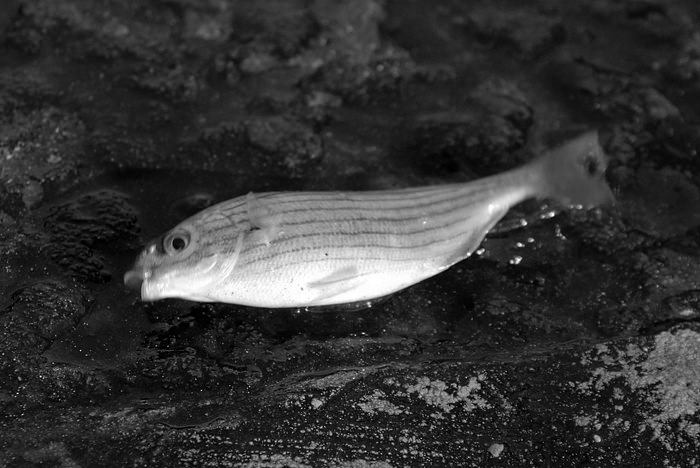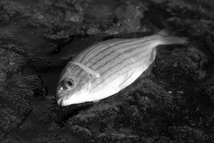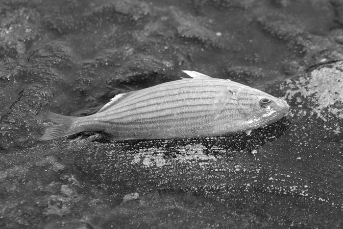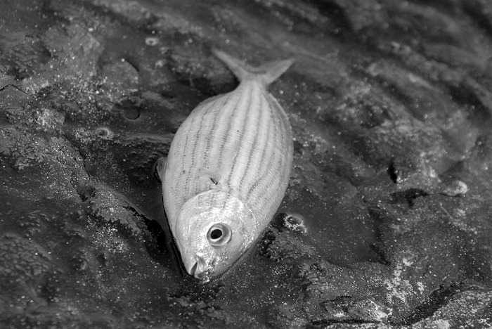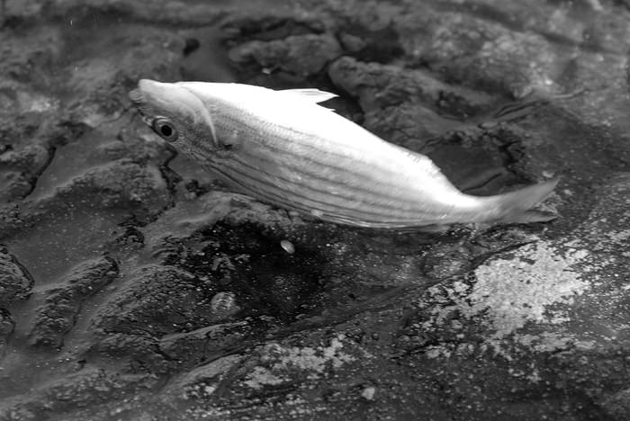 Fantič, verjetno star okoli 6 let na roke (s trnkom na laksu) lovi ribice na obali. Seveda mu par ur nobena ribica ne pokaže niti najmanjšega interesa, da bi se ujela na njegovo vabo. Vendar ima fantič srečo in potegne ven precej “luštkano” ribico, ki ji odstrani trnek iz ust in jo pusti ležati na suhem. Ker sem bil blizu njega s fotoaparatom in sem ravno fotkal sonce, sem ga vprašal če ga moti, če pofotkam njegovo ribo. Seveda je bil vesel in je dovolil.