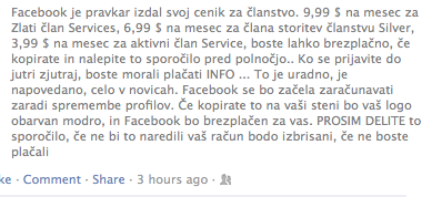 In še enkrat – Facebook ne uvaja članarine, niti ne bo zaračunaval dostopa. In nikar, prosim, nikar ne objavljajte vsega, kar nekdo napiše na Facebook na svoj profil. To vse skupaj izpade zelo zelo smešno. Vsaj v Google vtipkajte to, kar želite objaviti in boste takoj ugotovili ali je fake ali drži. In nihče se vam ne bo smejal!