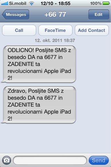 Dve leti nazaj sem pisal o resnični zgodbi kolega – SMS kvizi, SMS klubi in zavajanje javnosti, sedaj pa nekaj podobnega doživljam tudi sam. Namreč že večkrat sem dobil SMS sporočilo iz telefonske številke +6677 z vsebino: Zdravo. Posljite SMS z besedo DA na 6677 in ZADENITE ta revolucionarni Apple iPad 2!