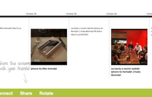 timekiwi namreč omogoča povezovanje različnih družbenih omrežij – Twitter, Facebook, instagram, Flickr, Foursquare in Tumblr in kreiranje “časovne črte – timelinea”, kot smo ga navajeni na Facebooku.