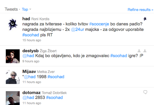 nagradno vprasanje za tviterase – koliko tvitov #soocenje bo danes padlo? nagrada najblizjemu – 24ur majcka – za odgovor uporabite #soohad