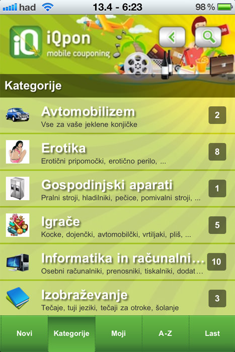 Nič od tega ni potrebno. Namreč iQpon je orodje, oz. komunikacijski kanal, preko katerega “prodajalci” ponujajo svoje popuste in nikomur ni potrebno nakazovati denarja in potem iskati termin, kdaj bi komu ustrezalo, da ga unovči. Preprosto – poiščeš kupon po različnih kategorijah in greš v trgovino, kjer prodajalcu pokažeš kupon v aplikaciji in dobiš popust.