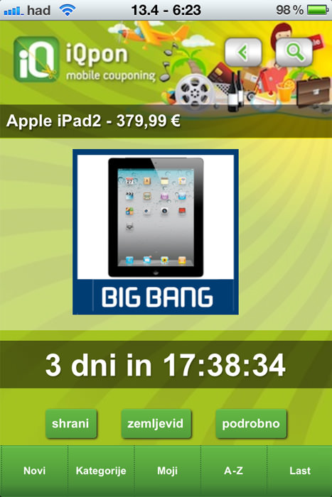 Primer: Big Bang ponuja 20 eurov cenejši iPad preko iQpona – vse kar je potrebno je to, da grem s svojim mobilnim telefonom in aplikacijo v Big Bang in pokažem ta kupon! In dobim popust.