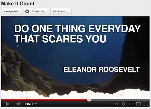 Make it count videoposnetek, kjer je uporabljen citat Eleanor Roosevelt, mi včeraj cel dan ni dal miru. Prekleto veliko resnice se skriva v tem citatu – Do one thing every day that scares you. Strah nas je, bežimo pred stvarmi, ne upamo se soočati z njimi. Lažje nam je, če gre življenje nekako svojo pot mimo nas in mi ne poskušamo spreminjati lastnega sveta, ampak poskušamo vplivati na ves preostali svet – veliko bolj preprosto je in manj smo prizadeti, če smo se odločili napačno. Ker nočemo daljših poti, ker se bojimo sprememb, predvsem pa ker si ne želimo spreminjati svojih utečenih smernic. Rajši ostajamo na mestu, oz. se sučemo v začaranem krogu, iz katerega težko najdemo izhod. Živimo v kletkah, ki smo si jih sami postavili, kljub temu, da je okoli nas svet, ki nas čaka, vabi…