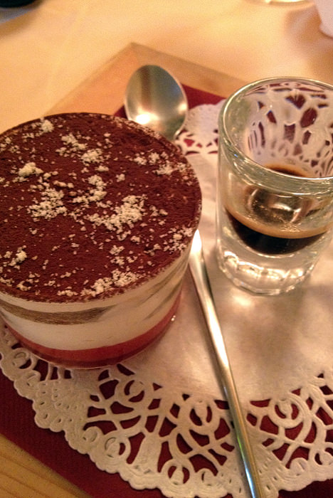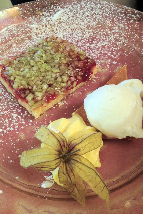 - tiramisu z jagodami / krostata z rabarbaro, vanilijevo kremo in sladoledom iz vanilije