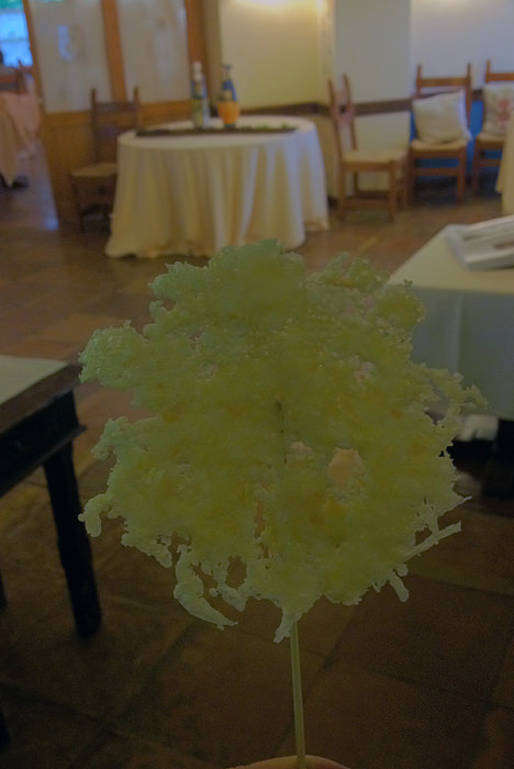 Ob prihodu v gostilno Pri lovcu / Al cacciatore in po ureditvi formalnosti, sva bila postrežena s penino in liziko iz sira. Ker ne pijem alkohola, sem bil zopet v malce slabšem položaju, kot bi bil, če bi lahko zraven užival še v vinu. Prostori v gostilni so prijetni, domače opremljeni in dejansko prikazujejo s čim se družina Sirk ukvarja. Sredi glavnega prostora je odprto kurišče, kjer se ročno kuha njihova polenta. Zanimivo je bilo, da je bila restavracija, kot sem že prej omenil, glede na uro povsem polna. Ampak da ne bo pomote, niso bili samo Italijani, ampak tudi Nemci in Francozi. Prijazno osebje govori vse mogoče jezike, tako da ni problem pri sporazumevanju – edini problem je, ko ti prijazno osebje začne naštevati, kaj imajo na meniju, za odločitev. V bistvu bi vse poizkusil, ker se vse sliši tako dobro in kot sem kasneje ugotovil, se ne sliši samo dobro, ampak to dejansko tudi je!