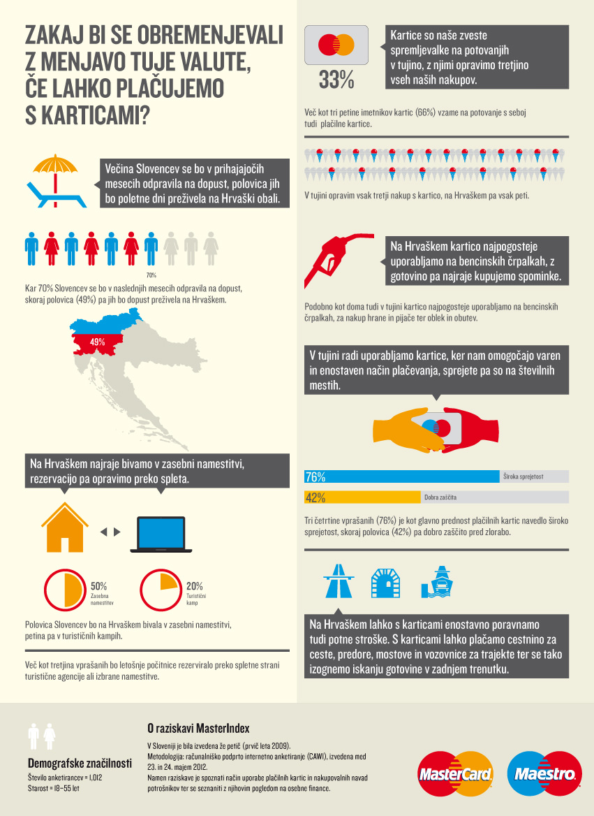 Spodnja infografika, podjetja Mastercard je zanimiva in tudi odlično narejena in prikaže naše navade plačevanja nakupov v tujini s karticami. No, zase lahko mirno trdim, da me niso zadeli, saj zelo zelo redko karkoli plačam z gotovino – zato imam kartico!