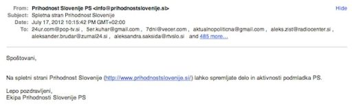 Všeč mi je, da ima Pozitivna Slovenija svoj podmladek in da ima prihodnost Slovenije PS svojo spletno mesto na naslovu http://www.prihodnostslovenije.si/. Tudi lepo je, da ste obvestili medije o tej zadevi, ampak prosim, ampak res prosim, da nikoli več ne storite tega, kar ste storili – vse prejemnike (492) ste dali v polje TO!