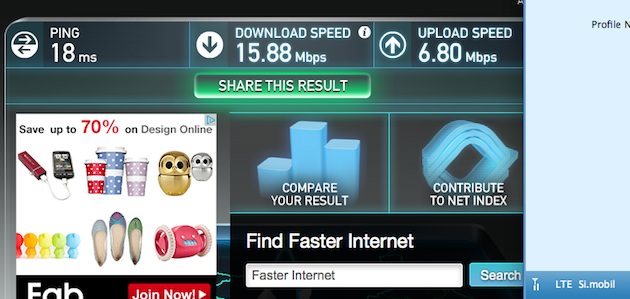 Ker v zadnjih dneh, ko sem testiral LTE omrežje, nisem bil na Bledu, ali Brniku, sem izkoristil Ljubljano za poligon in bil nad rezultati hitrosti LTE omrežja zelo presenečen. Potrebno je upoštevati, da imam doma hitrost interneta 4/756k (hitreje pač ne gre pri kabelskem operaterju!) in mi je vsaka številka pri prenosu (dolpotegu) nad 10Mb/s pravo razodetje. Tako sem tudi dolpotegnil Mountain Lion (psst!). Hitrosti, ki sem jih dosegal v Ljubljani, so varirale od 12Mb/s do 10Mb/s v smeri do mene in od 5Mb/s do 3Mb/s od mene – meritve sem opravil s pomočjo spletnega mesta – http://www.speedtest.net/.