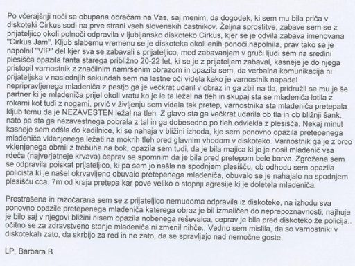 Danes so mediji polni informacij o pretepu, ki se je zgodil v Cirkusu (v četrtek, oz. v petek – že v tem se zgodbi razlikujeta) v Ljubljani. Namreč varnostniki naj bi pretepli obiskovalca in ga iznakazili – o tem priča očividka, ki je poslala svoje videnje dogodka v medije. Seveda so mediji z veseljem napletli celotno zgodbo (Požar) in povezali vse skupaj z Jankovičem in ostalimi. Ampak kot vsaka zgodba ima tudi ta dve strani. Ena je očividkina, druga je zgodba, ki jo je javnosti predstavil Cirkus.