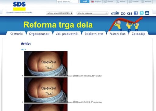 Predvidevam, da bodo zjutraj mediji že polni novic, kako so hekerji napadli spletno mesto stranke SDS in kako so se na njej pojavile gole riti z napisom obdavčite tole! In res so ga. Dokaze si lahko ogledate na spodnjem “printscreenu”, oz. s klikom na povezavo http://www.sds.si/.