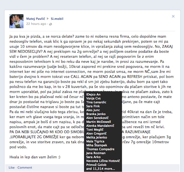 Kaj se je zgodilo? Uporabnik je napisal dokaje jezen komentar na Facebook profil Simobila, ki pa je v treh dneh prejel več kot 11.000 lajkov in ima preko 900 komentarjev! Jeap. Številke so impresivne in ta zapis se je širil po Facebooku z zelo veliko hitrostjo.