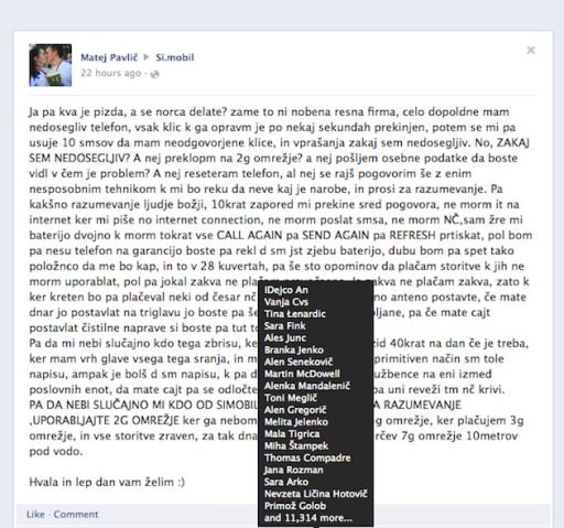 Pa se ti zdi, da bi ta komentar dobil toliko lajkov, če ne bi bilo v njem vsaj kančka resnice? Kot CM vem, kaj pomeni, ko se ti troll obesi na FB in ne podpiram takšnega načina komuniciranja, zato posta nisem polajkala, čeprav razumem jezo uporabnika. Tudi meni (in veliko ljudem, ki jih poznam) se dogaja povsem enako. Ne bom pisala grdih postov na FB, enkrat bom samo zamenjala operaterja in to je to. In takšnih je veliko ljudi. Upam, da Simobil rešuje tole težavo.