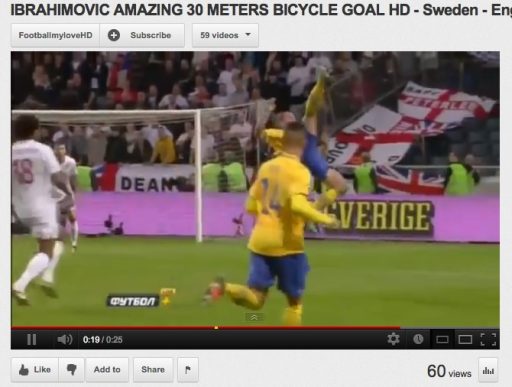 O nogometu nimam pojma. Nikoli ga nisem znal igrati, prav tako pa sem le redko spremljal tekme – razen ob prvenstvih, ki pa itak namenjeni druženju in “gostilniškemu” komentiranju igralcev, trenerjev in sodnikov. In kljub vsemu prej naštetemu, mi je pogled na gol, kot ga je dosegel Zlatan Ibrahimovič (letno zasluži v klubu Paris Saint-Germain okoli 14 mio eurov!), na tekmi Švedska : Anglija, ko je s škarjicami zadel gol iz razdalje več kot 30 metrov, hudo dober!