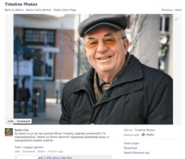 O fukfehtanju, oz. likefehtanju na Facebooku sem že večkrat pisal. Strokovnjaki za družbena omrežja, ki jih je v Sloveniji vsak dan več, izkoristijo vsako priložnost, da svoje “oboževalce” vključijo v komunikacijo in jim povedo, da je prav, da lajkajo njihove “pametne” statuse. In tudi danes, ko je umrl Miran Trontelj, se nekateri poslužujejo te metode. Recimo Radio City je to naredil na takle način: