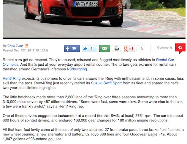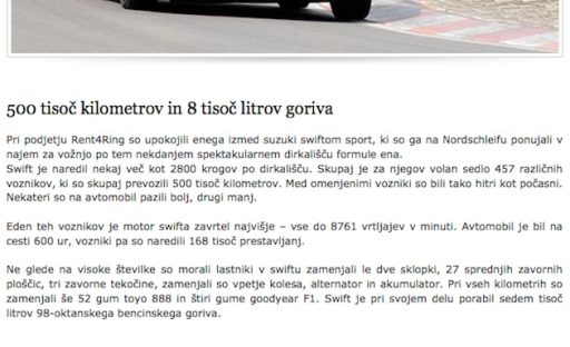 Poglejmo primer originalnega članka It’s a hard knock life for a Nürburgring rental car , kjer so zapisali o Suzuki Swiftu:
