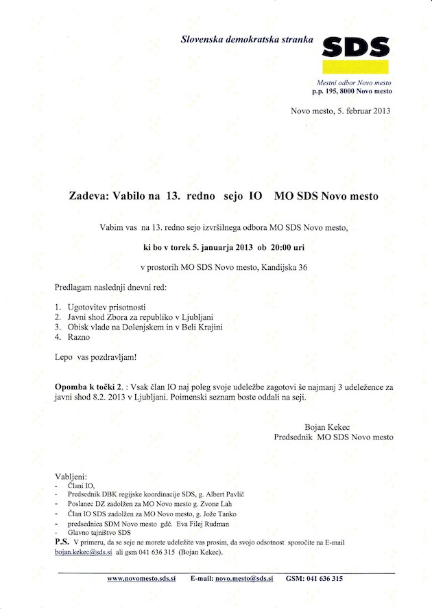Vsak član IO naj poleg svoje udeležbe zagotovi še najmanj 3 udeležence za javno shod 8.2.2013 v Ljubljani. Poimenski seznam boste oddali na seji.