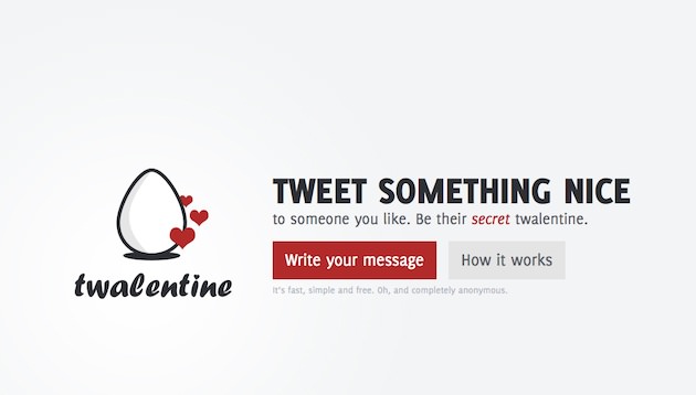 Tilen Držan je naredil zanimiv spletni servis, ki temelji na Twitterju – http://twalentine.com/. Uporabniku omogoča, da anonimno sporoči svoji ljubezni svoje misli, želje,… karkoli lepega. In v bistvu servis ni namenjen samo za Valentinovo, ampak ga lahko uporabite od katerikoli priložnosti, ko želite nekomu sporočiti svoje skrite misli.