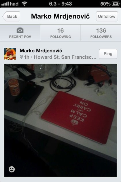 Vendar sem včeraj doživel povsem drugačno uporabniško izkušnjo, ko sem aplikacijo posodobil in ugotovil, da je Povio dejansko odlična zadeva, ki omogoča zelo preprosto stvar – vsi poznamo prvo vprašanje, ko koga pokličemo po telefonu – kje si.. No, pri Povio pa nam tega ni potrebno vprašati, ampak preprosto uporabnika “pingnemo” in on objavi sliko, kje se trenutno nahaja, oz. kaj trenutno počne.